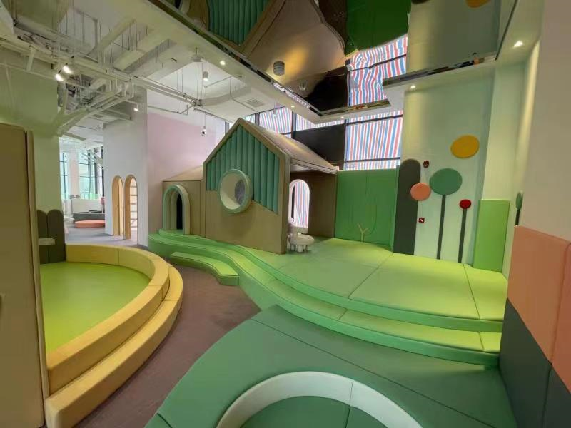 在阿貍的童話世界設(shè)計(jì)中,我們通過(guò)對(duì)紅、綠、黃等主要色塊的搭配與協(xié)調(diào),打造了極具吸引力的視覺(jué)效果,配充滿童夢(mèng)風(fēng)格的阿貍元素背景墻,營(yíng)造整體空間的溫暖風(fēng)格,以此讓兒童在安全放松、氣氛明快、活躍的游樂(lè)環(huán)境中享受玩耍所帶來(lái)的酣暢愉悅感。